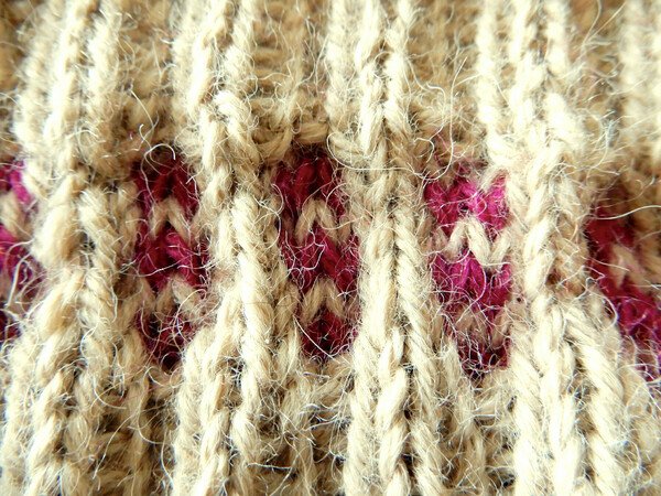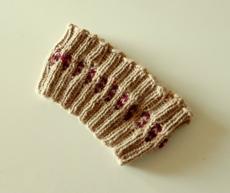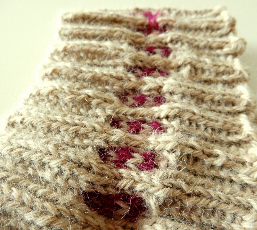 Schwierigkeit: mittel (in Runden auf einem Nadelspiel stricken, zweifarbiges Einstrickmuster)
