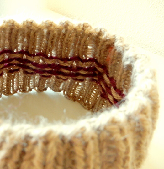 Garn: Apu Kuntur Alpaca Soft (100% Alpaka, 100m/50g), 1 Knäuel von jeder Farbe. Verbrauch für das Beispiel: 44m von Farbe 1 (beige) und 4m von Farbe 2.