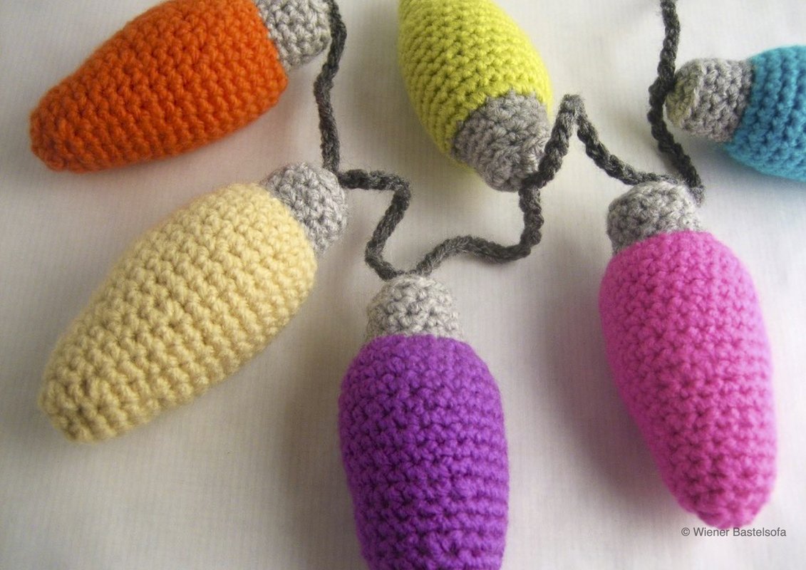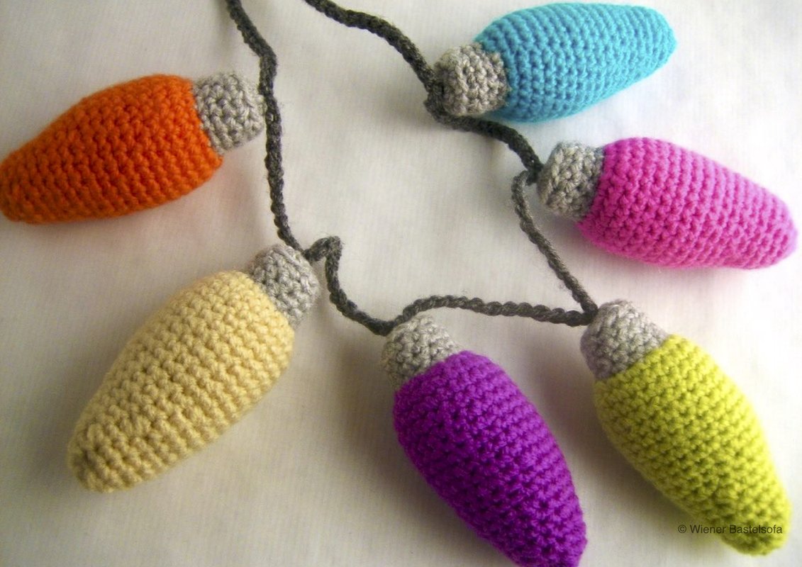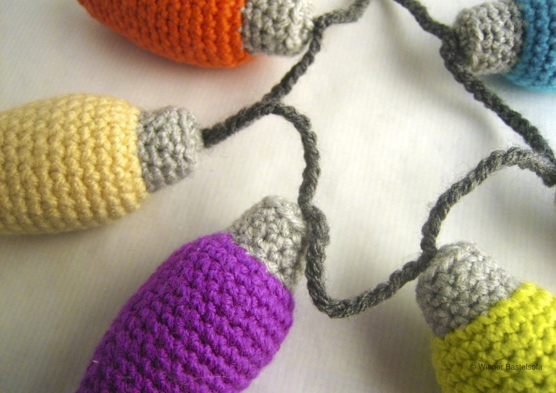 Die einzelnen Glühbirnen sind einfach anzufertigen. Die Lichterkette kann auch wunderbar mit Wollresten gehäkelt werden.