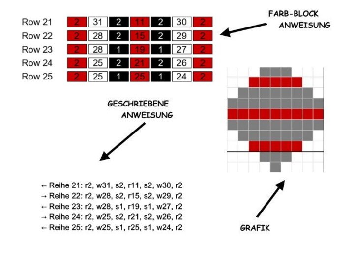 -geschriebene Instruktionen - Reihe für Reihe (für feste Maschen)