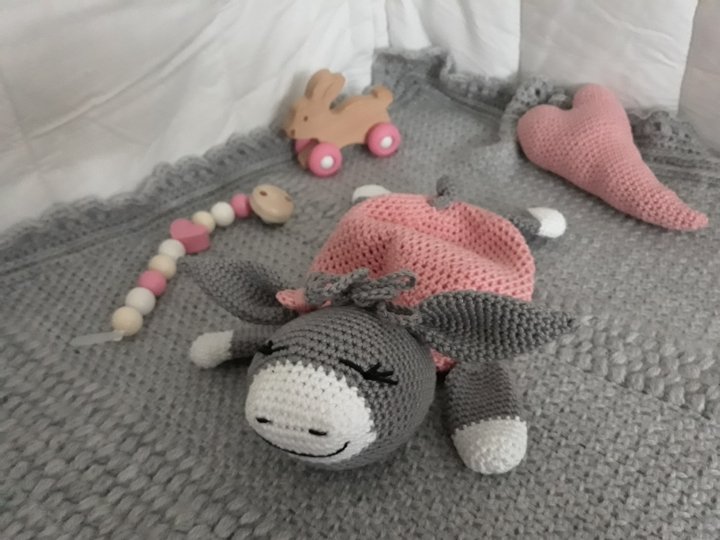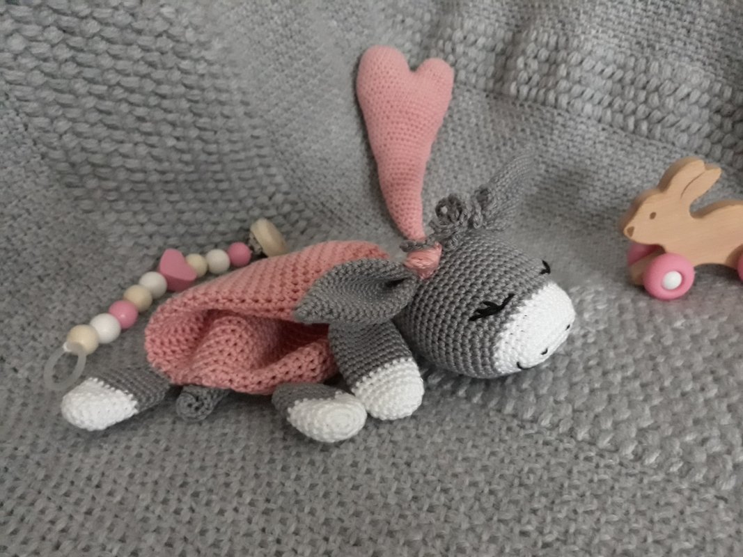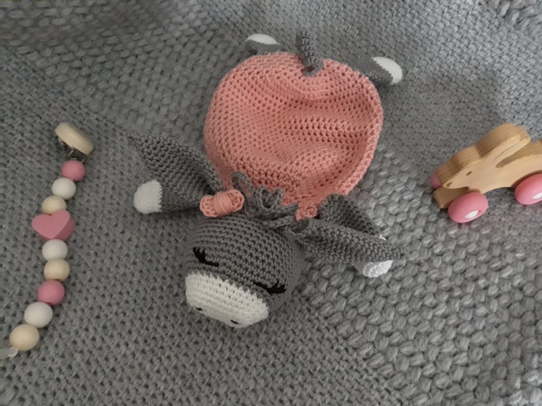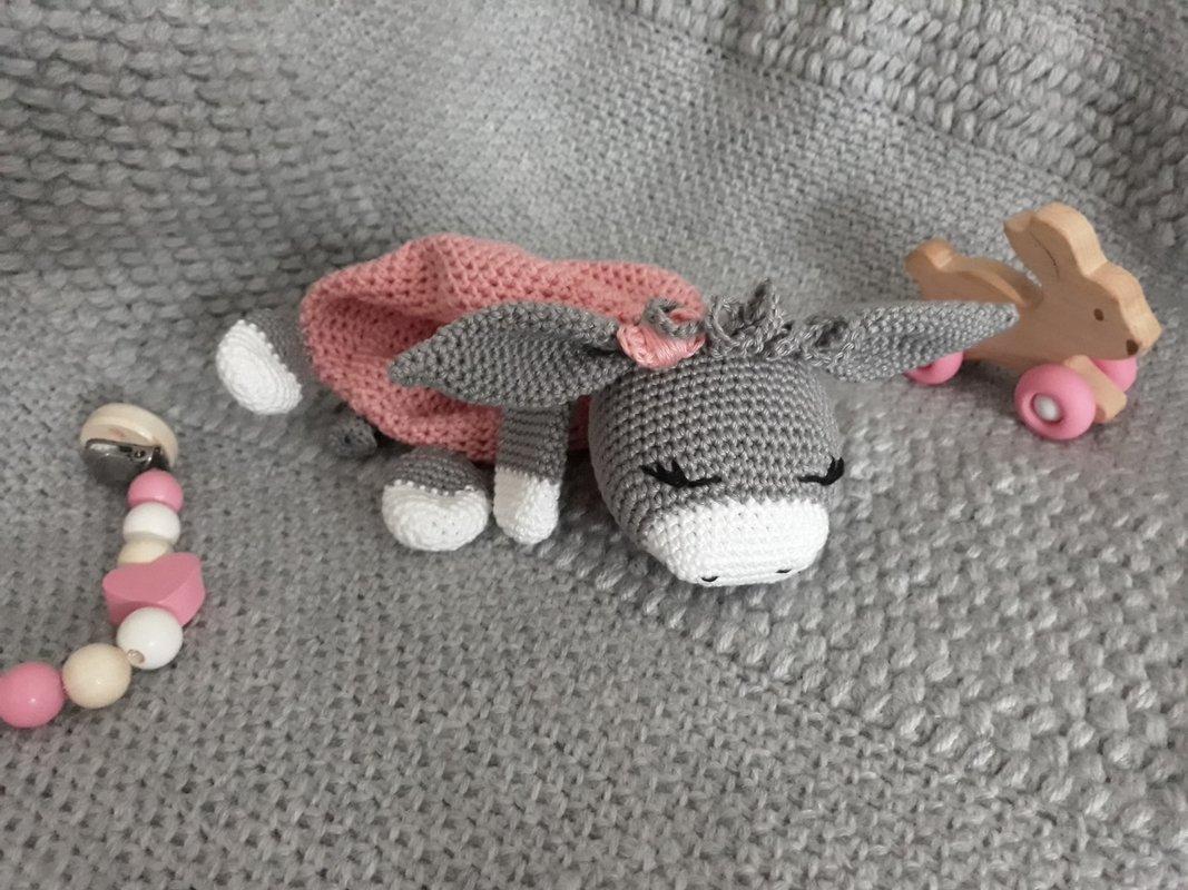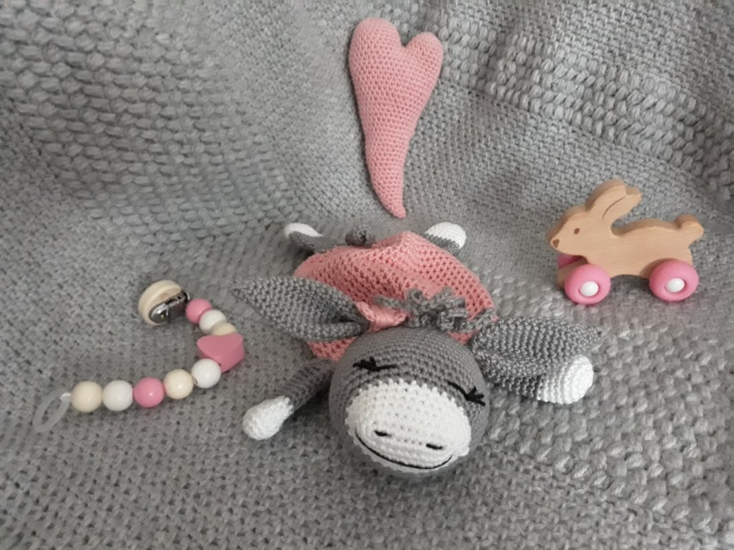 Der Schmuseesel Bella ist ca. 25 cm groß. Also eine perfekte Größe für neue, kleine Erdenbürger.