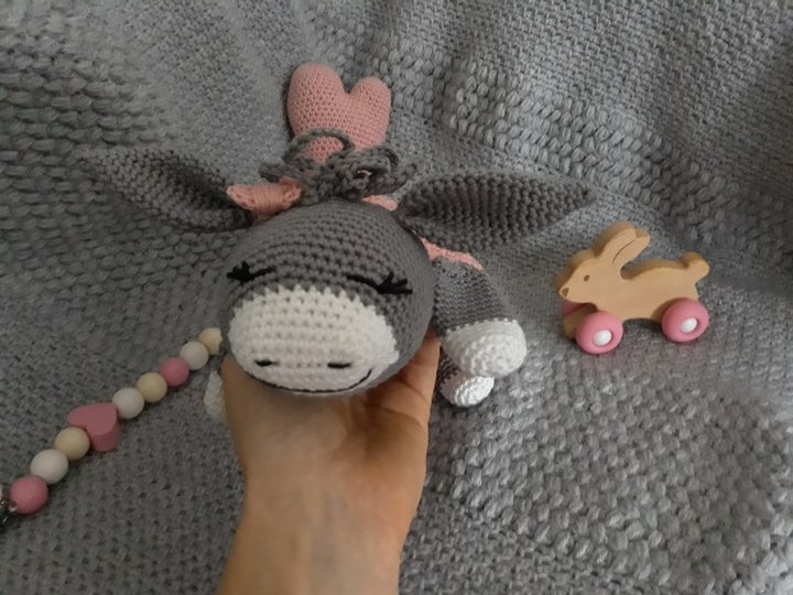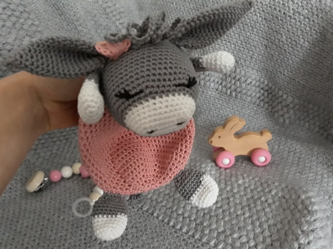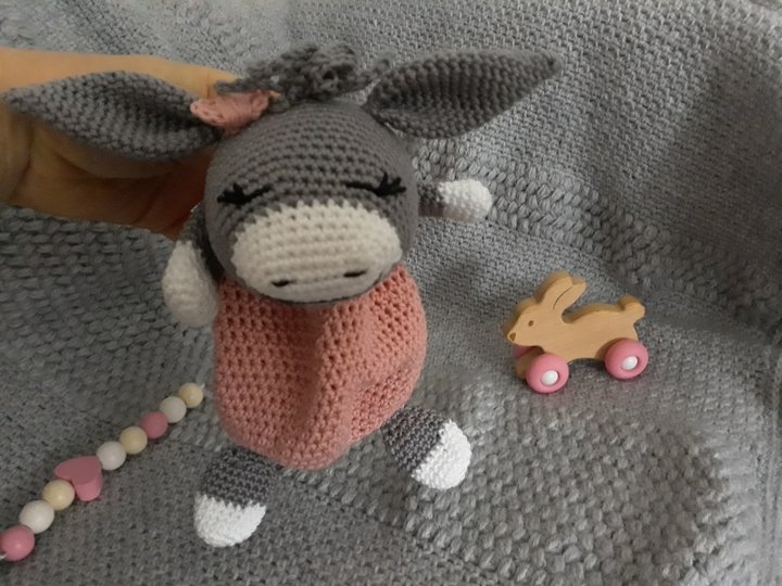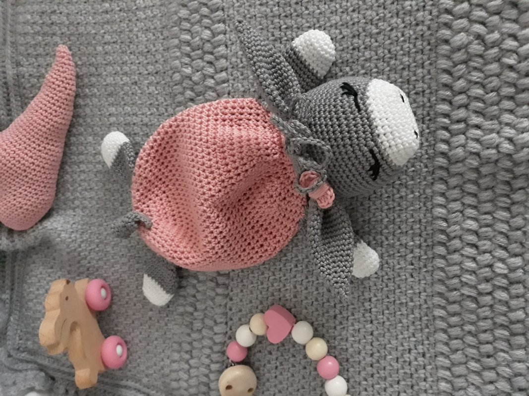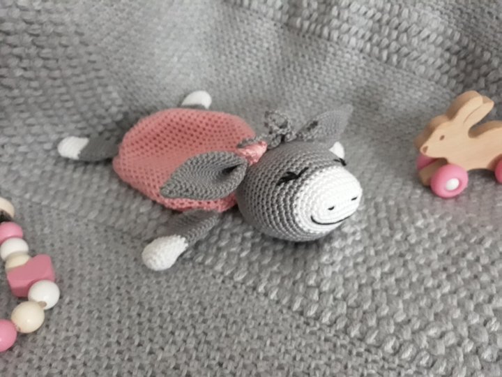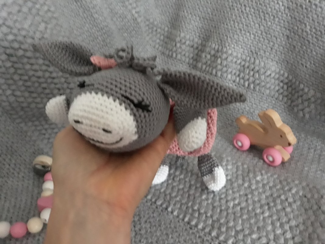 Der Schmuseesel Bella ist ca. 25 cm groß. Also eine perfekte Größe für neue, kleine Erdenbürger.