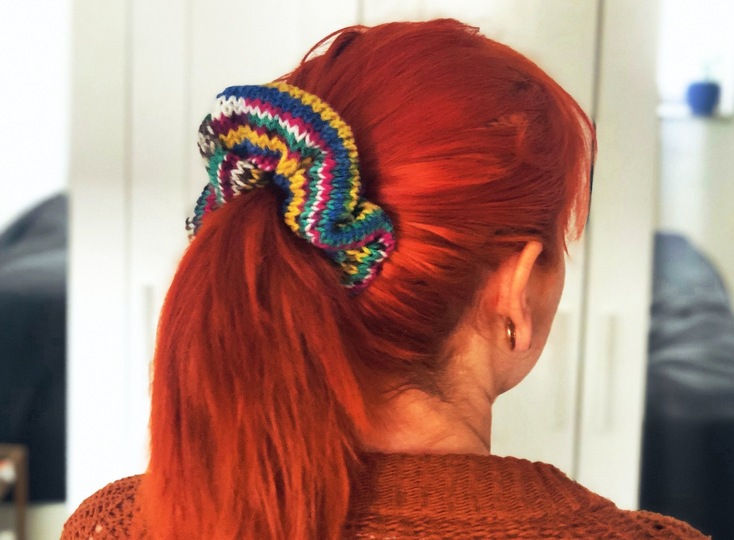 Stricke dein eigenes Scrunchie. Absolut im Trend an jedem Pferdeschwanz oder locker ums Handgelenk gebunden.