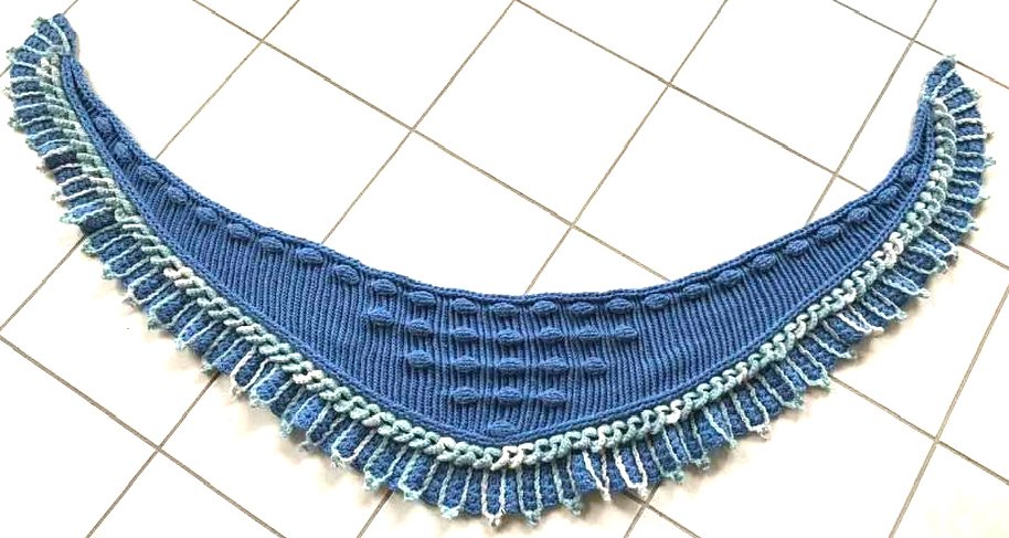 Das große Tuch ASKELLA wiegt fertig um die 450 gr und ist 240 cm lang und an der breitest Stelle 40 cm.