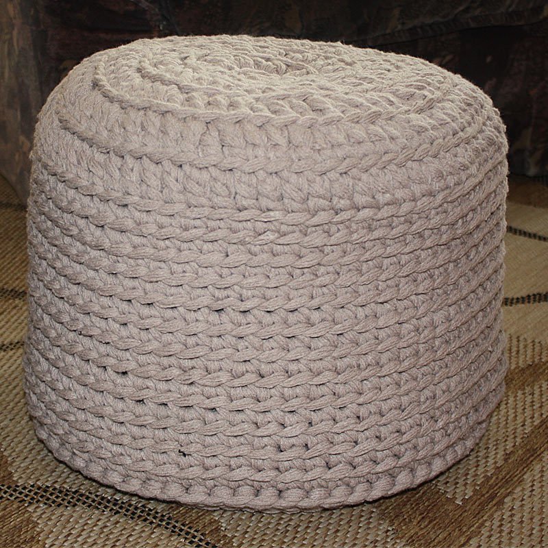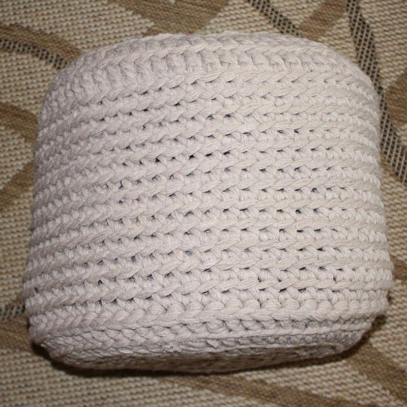 Gehäkelter Sitzsack oder Pouf aus dickem Garn. Er ist mit Stäbchen und festen Maschen fest gehäkelt.