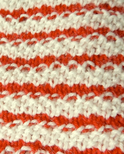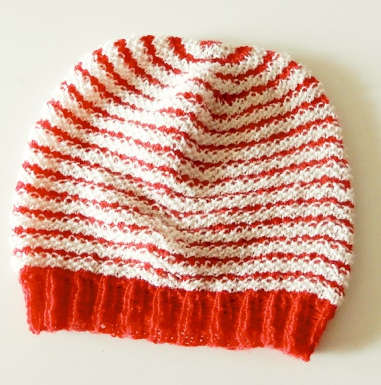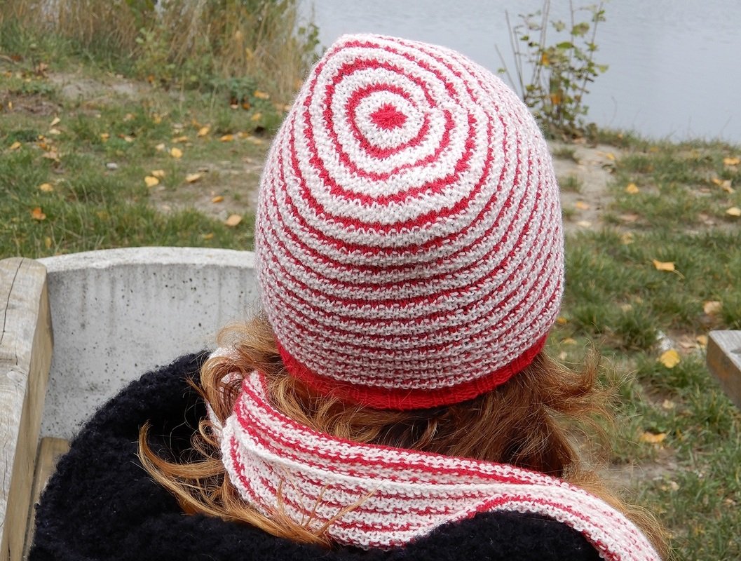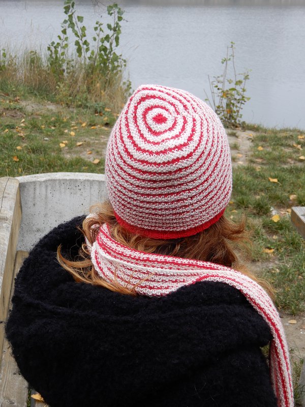 Garn: Lang Yarns Jawoll Superwash 75/25 (75% Wolle, 25% Nylon; 209m/50g),Für die Mütze 1 Knäuel von jeder Farbe. Verbrauch für das Beispiel in Erwachsenengröße: 88m in Farbe 1 (rot) und 113m in Farbe 2 (weiß).
