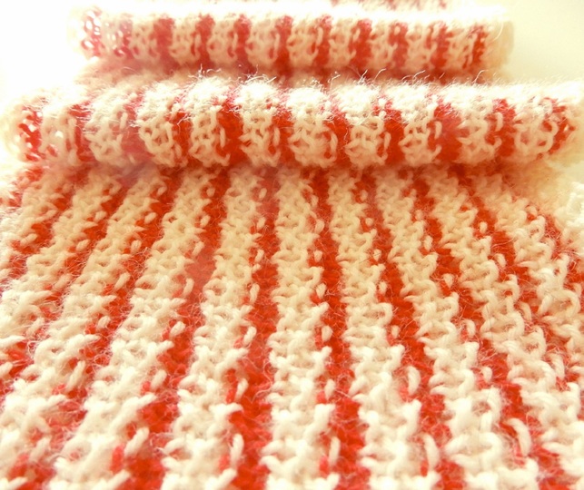 Für den Schal 2 Knäuel in Farbe 1 (weiß) und 1 Knäuel in Farbe 2 (rot). Verbrauch für das Beispiel mit 11 Musterwiederholungen: 260m von Farbe 1 und 71m von Farbe 2.