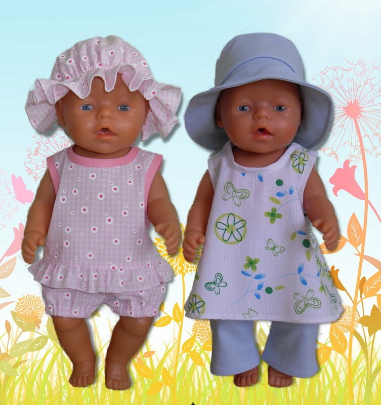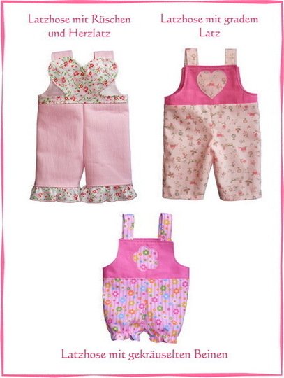 Latzhose in 2 Varianten und 4 verschiedenen längen, Baby Dol mit und ohne Ärmel, Schlafhöschen, Schlafmütze, Sommershirt, Legging, Hose mit leichtem Schlag, Hängerkleidchen, Hut