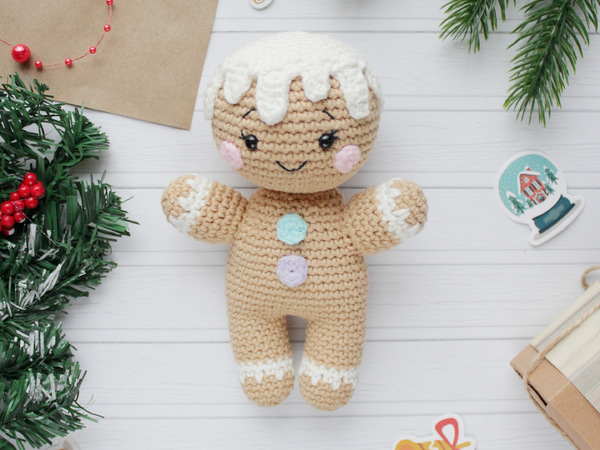 Die Häkelanleitung im PDF-Format besteht aus 11 Seiten der detaillierten Schritt-für-Schritt-Anleitung, wie man süßen Lebkuchenjungen häkelt
