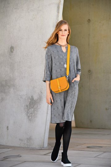 Ganz schlicht im Schnitt, spart dieses sportliche Kleid nicht mit einer Portion Extravaganz: Sportliche Optik durch Garcon-Streifen. Der Ripsbandstreifen wird aufgebügelt, der rückwärtige Reißverschluss, ein modischer Fake, nur aufgesteppt.