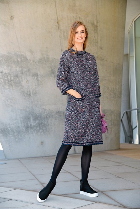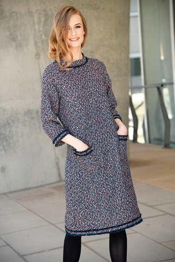 Nähanleitung für ein knielanges Kleid, das ideal für die kühle Jahreszeit ist. Aus Tweedstoff genäht, hält es schön warm. Mit markanterm Reißverschluss am Rücken und Taschen vorn.