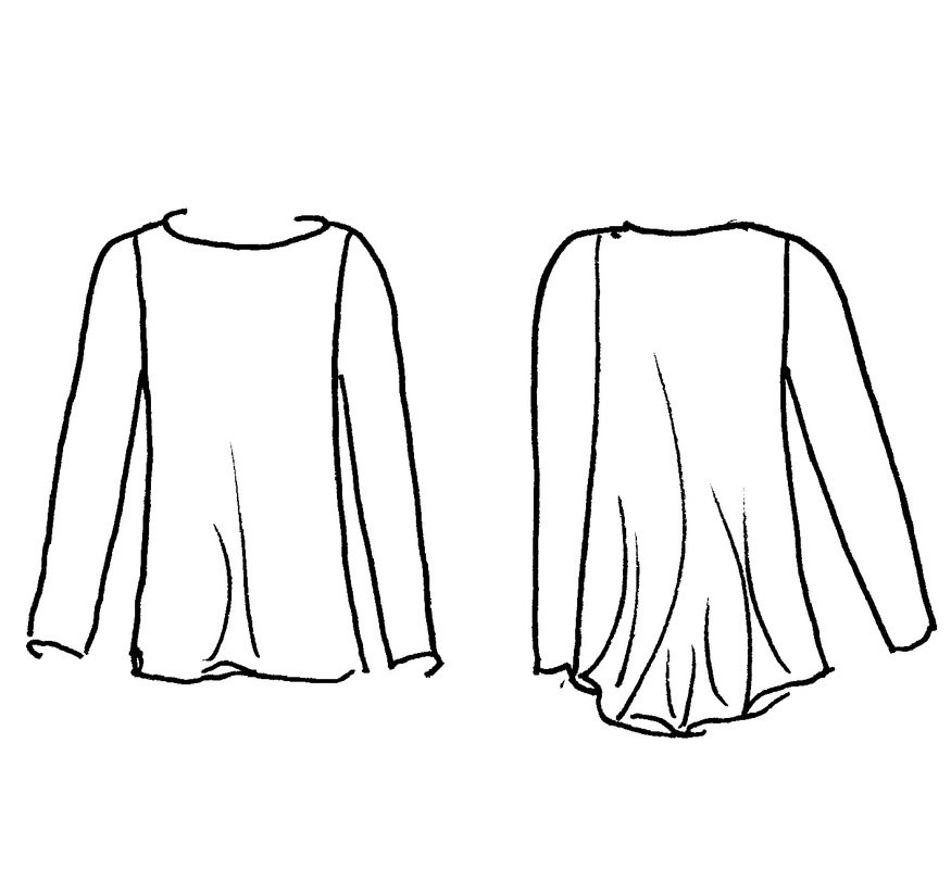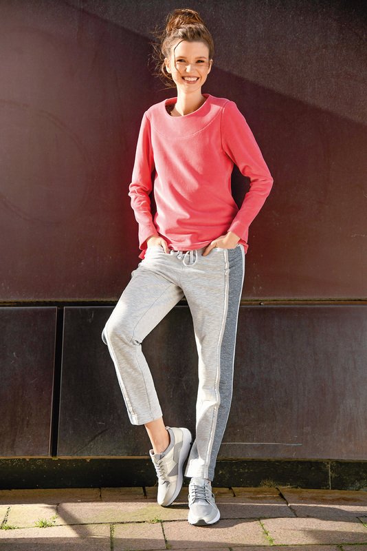 Kuschelig und sportlich ist das Shirt aus dem dicken Nickystoff, das ihr mit dieser Nähanleitung nähen könnt. Der Kragen ist rund, die Ärmel lang, Shirt in A-Linie. Hier sind die breiten Blenden und Säume, die gecovert wurden, gut erkennbar.