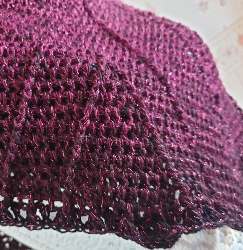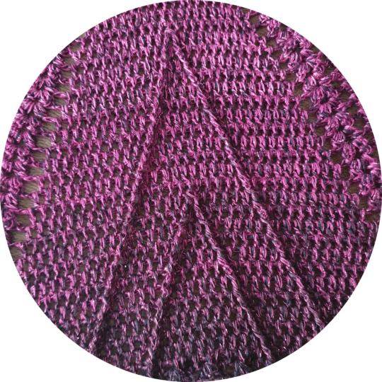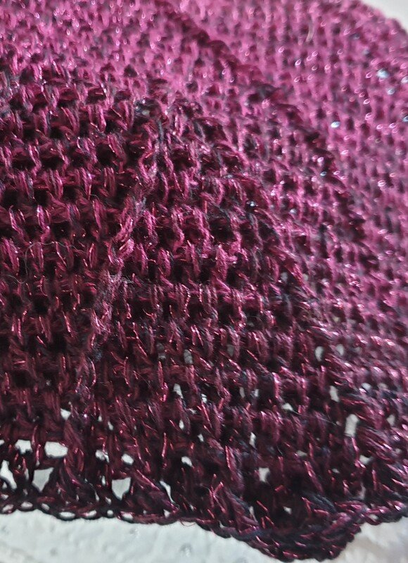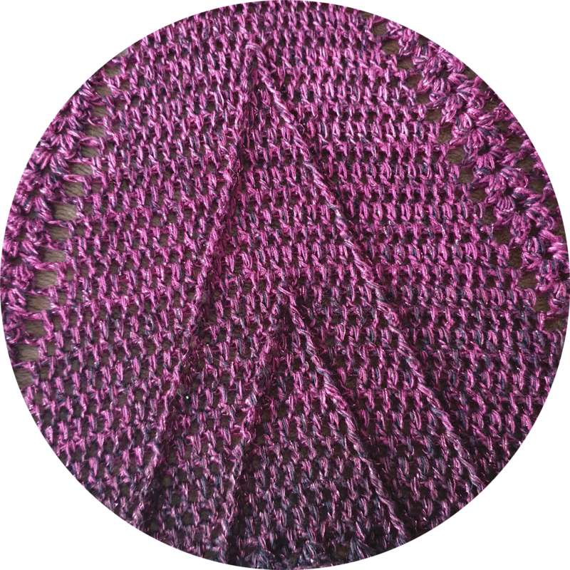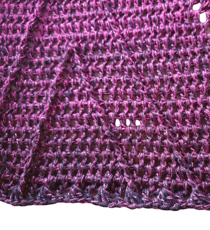 Für mein Tuch mit dem Reliefmuster habe ich einen Bobbel mit der NS 4,5 verarbeitet. Da ich wollte, dass ich es unter einer Jacke oder Mantel als Schal tragen kann, habe ich nur ca. 800m LL mit 3 Fäden plus Lurexfaden verbraucht und es hat damit eine Weite von 140 cm und ist ca. 45 cm tief.