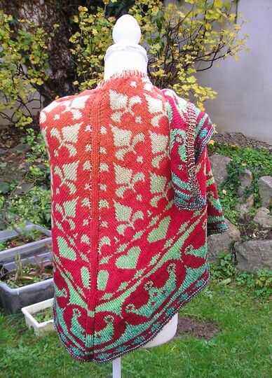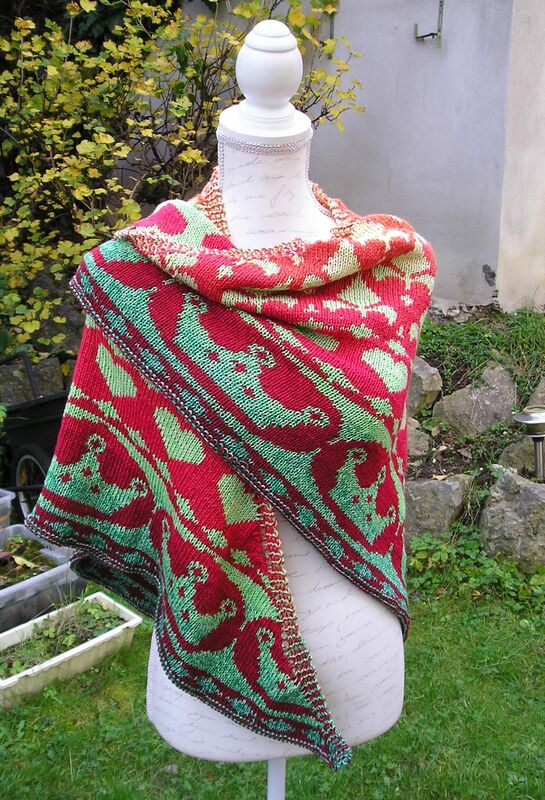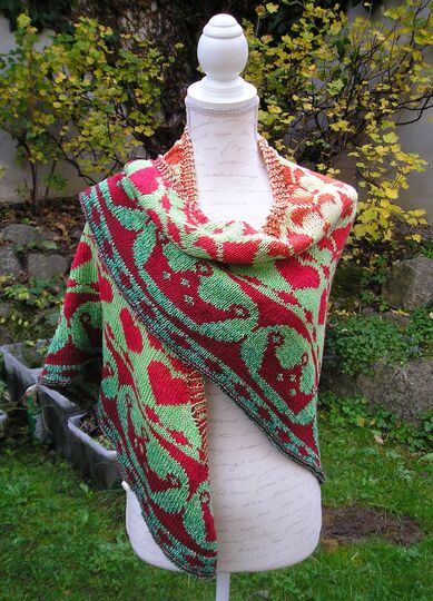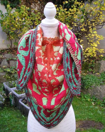 Das Tuch wird in Doublefacetechnik gestrickt. Dabei wird mit zwei verschiedenfarbigen Fäden gleichzeitig gestrickt. Es entsteht in einem Arbeitsgang ein zweilagiges Tuch, dessen Lagen durch den Wechsel der Farben untrennbar miteinander verbunden sind. Man erhält eine mit Farbe 1 glatt rechts gestrickte Vorderseite bei der das Muster in Farbe 2 eingestrickt ist. Die Rückseite ist ebenfalls glatt rechts gestrickt, aber in Farbe 2. Sie besitzt das gleiche Muster wie die Vorderseite, aber in Farbe 1. Das erfordert zugegebenermaßen hohe Konzentration und viel Geduld. Aber am Ende hat man ein tolles Ergebnis.
