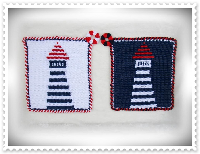 Er besteht aus 2 Hälften, die Vorderseite ist mit eingehäkelten Leuchtturm Motiv und die Rückseite ist einfarbig.