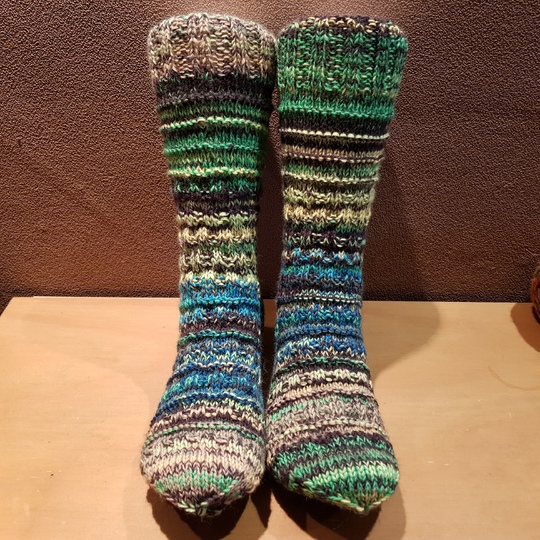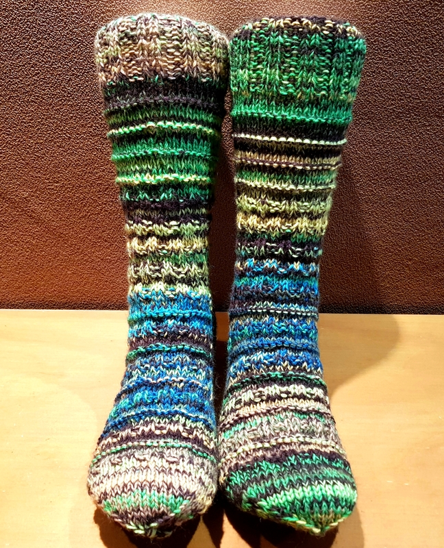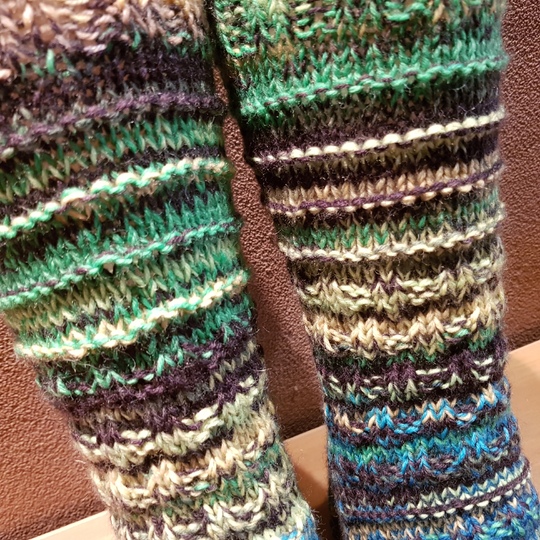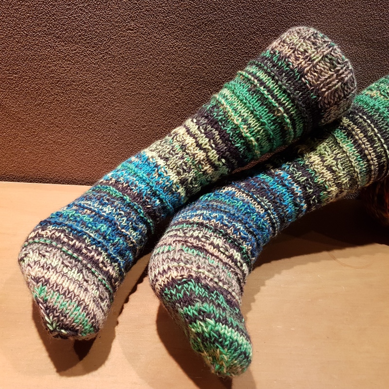 Ich habe die Socken als „Dickerchen“ (aus doppelter Sockenwolle 4fach mit Nadelstärke 3,5) gestrickt. Dabei gibt es schöne Effekte, wenn man 100g Sockenwolle als Hauptfarbe nutzt und diese im Doppel mit allem, was an Sockenwollresten noch da ist, verstrickt.