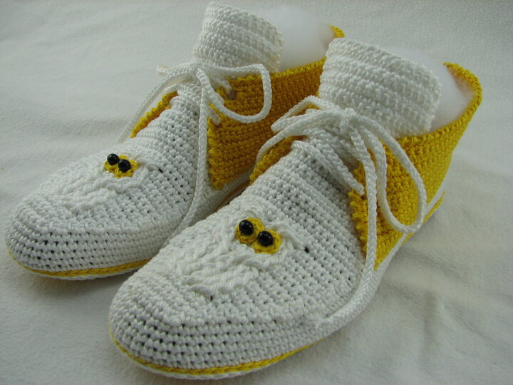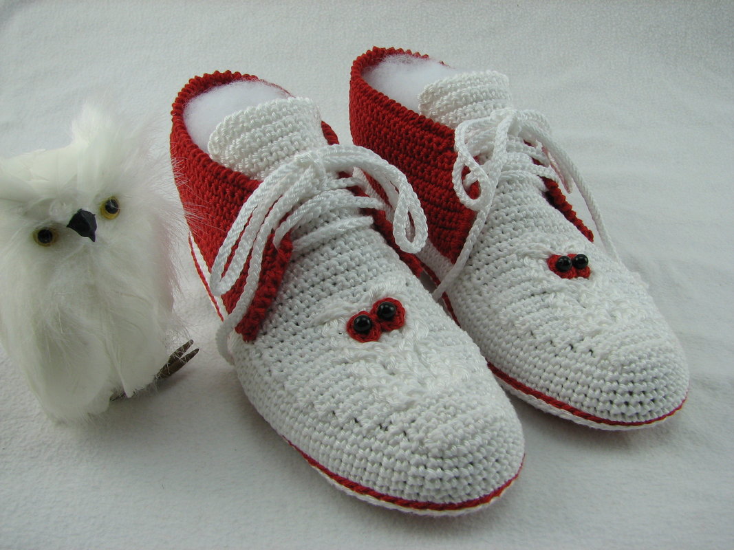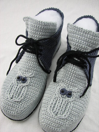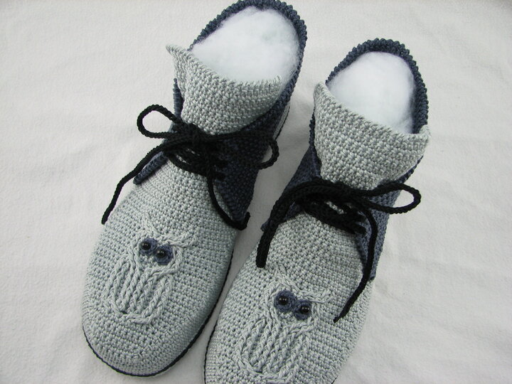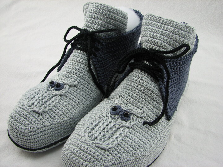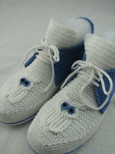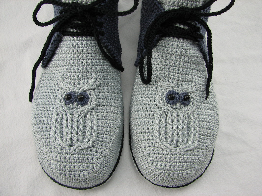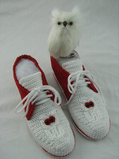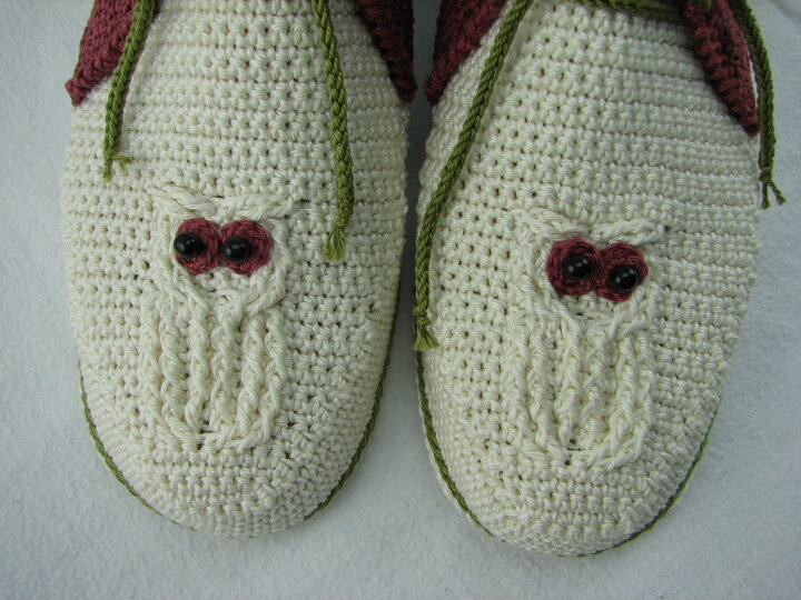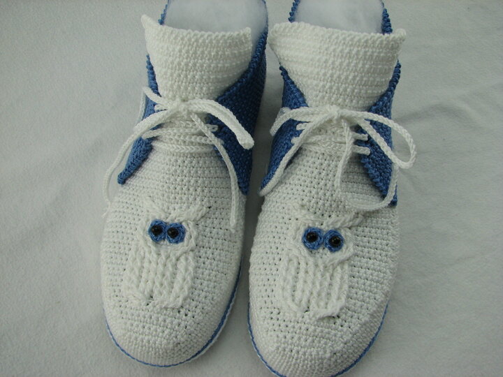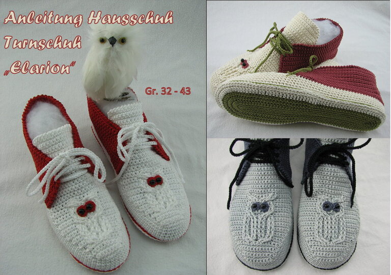Häkelanleitung für Hausschuhe in Turnschuhoptik. Der absolute Hingucker ist die Eule vorne auf dem Schuh. Durch die Verwendung des Baumwollgarns sind sie optimal für die Übergangsjahreszeiten geeignet. Die Schuhsohle ist ergonomisch geformt, so dass eine gute Passform gewährleistet ist.