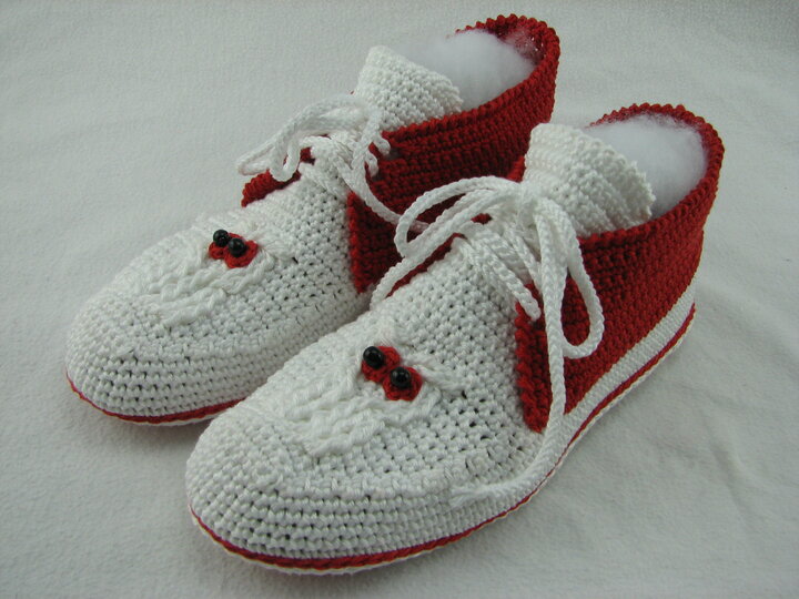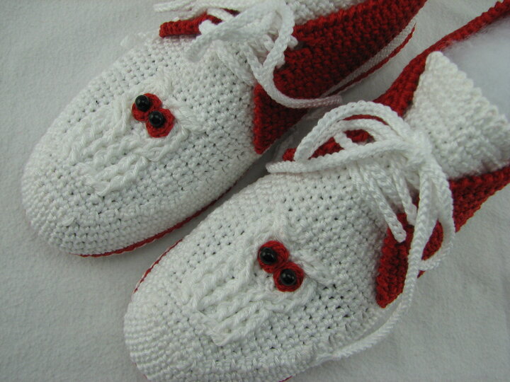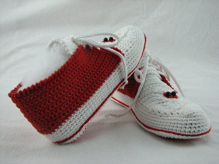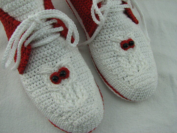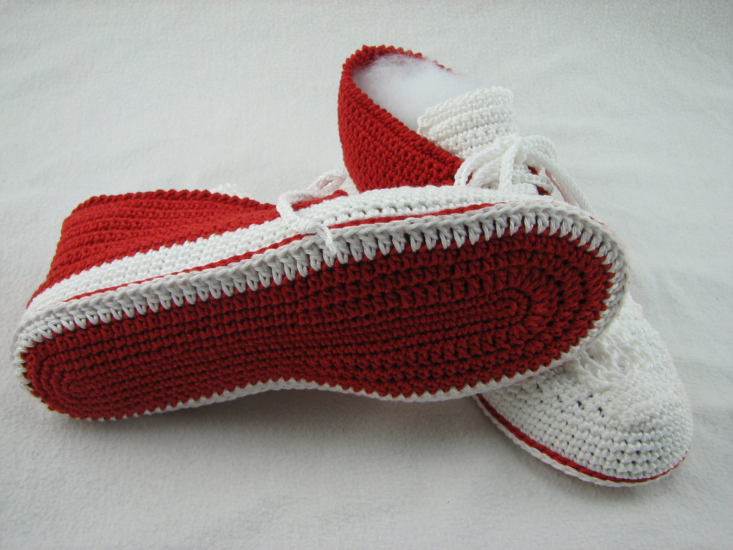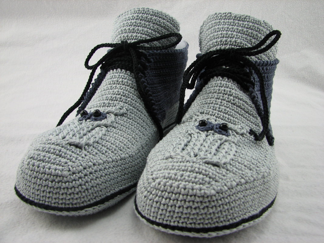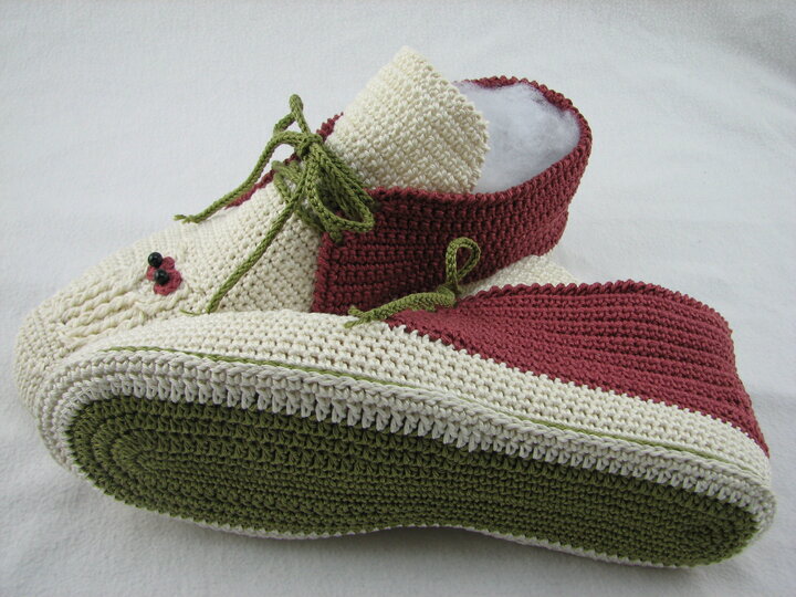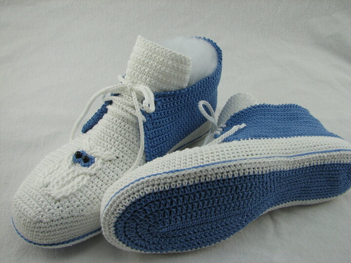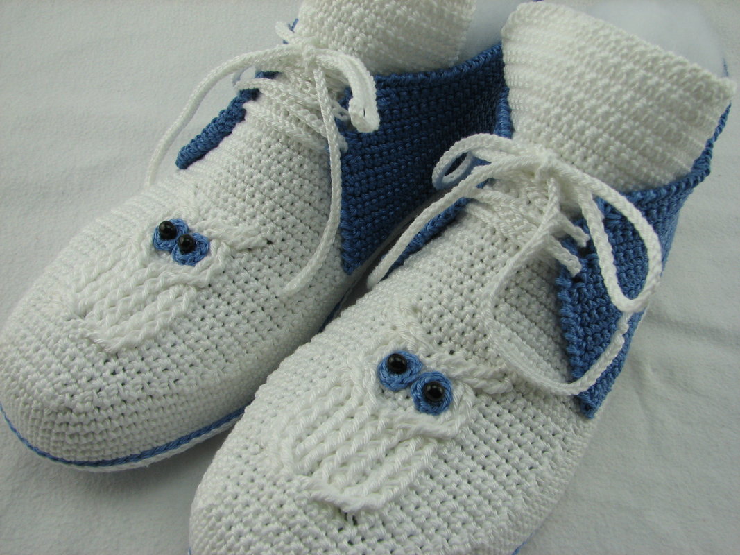 Häkelanleitung für Hausschuhe in Turnschuhoptik. Der absolute Hingucker ist die Eule vorne auf dem Schuh. Durch die Verwendung des Baumwollgarns sind sie optimal für die Übergangsjahreszeiten geeignet. Die Schuhsohle ist ergonomisch geformt, so dass eine gute Passform gewährleistet ist.