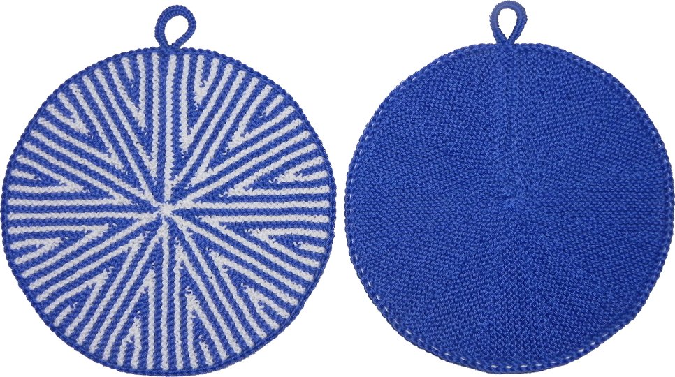 Dies ist eine Anleitung zur Herstellung eines gestrickten Topflappens in runder Form.