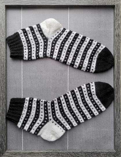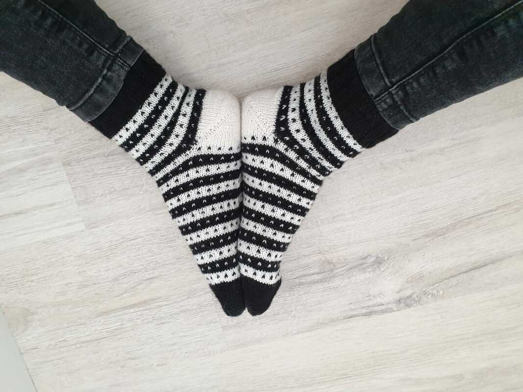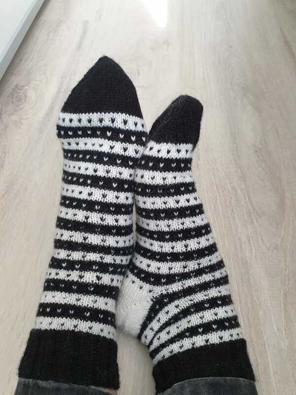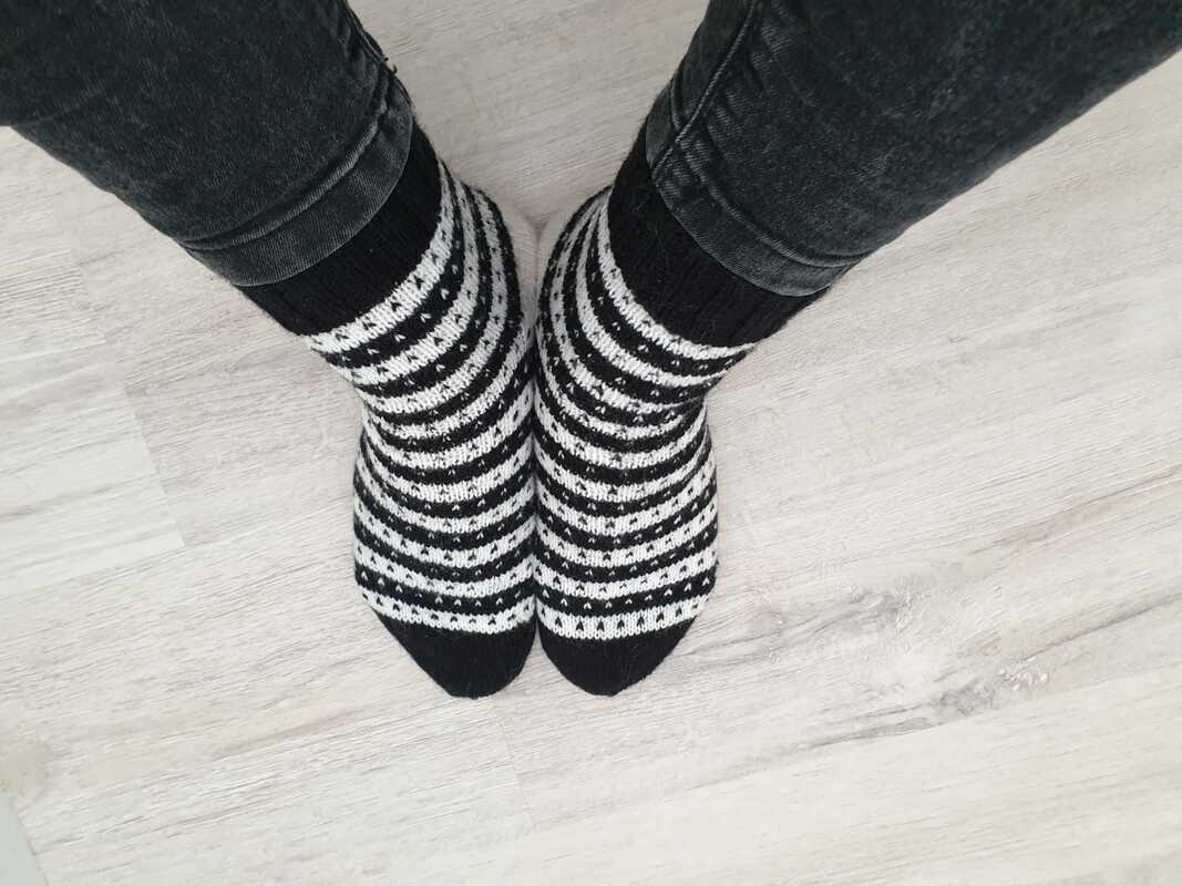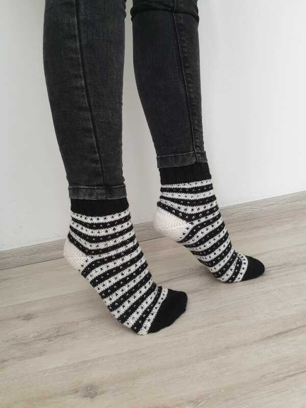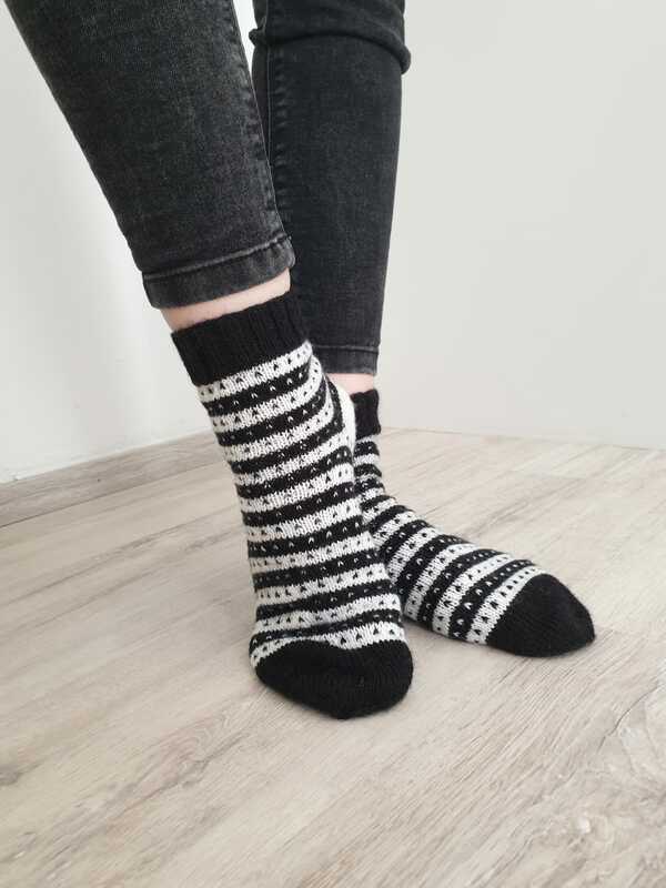 Material: Lana Grossa Meilenweit, je 50g in schwarz und weiß, Nadelspiel, Schere, Maßband, Nähnadel