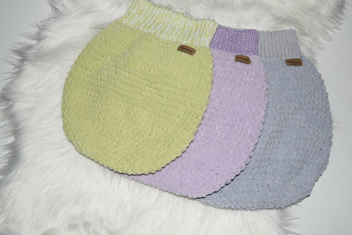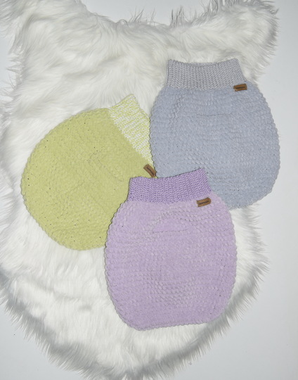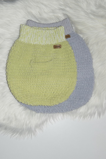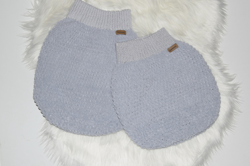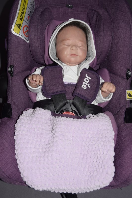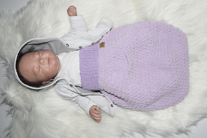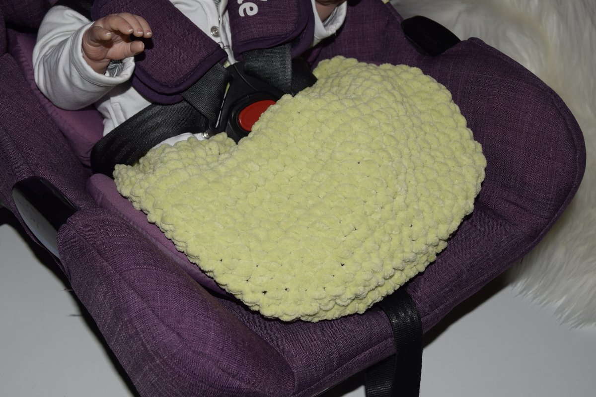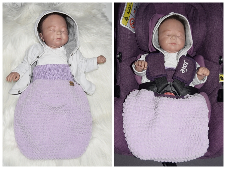Das breite Häkelbündchen ist sehr elastisch. Es sorgt für einen guten Sitz, passt sich perfekt an den Taillenumfang an und drückt nicht. Durch die Öffnungen in unterschiedlichen Höhen auf Vorder- und Rückseite des Fußsackes kann er leicht mit Baby in der Babyschale oder im Buggy angeschnallt werden. Die vordere Gurtöffnung ist dabei etwas höher und bauscht daher am Bauch nicht auf. Die hintere Gurtöffnung ist etwas tiefer. Damit ist hier genug Platz für den Windelpo. An jeder Gurtöffnung werden noch Laschen an die Rückseite gehäkelt, sie sorgen dafür, dass die Öffnung nicht zu weit aufklafft und dennoch das Anschnallen sehr leicht geht. Da der Fußsack nur in der Mitte angeschnallt wird, ist er passend für ein 3 Punkt-, sowie in ein 5 Punktgurtsystem und daher für alle Babyschalen und Kinderwagen geeignet.