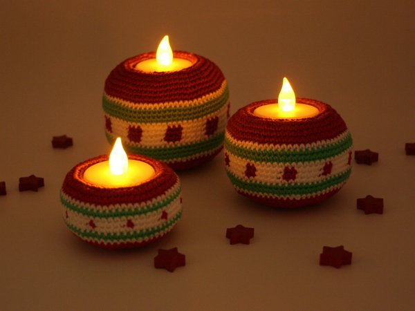 Du hättest es gerne kleiner oder größer? Kein Problem! Nimm einfach dünnere oder dickere Wolle. Standard-Teelichter mit einem Durchmesser von 3,6 cm passen dann aber NICHT MEHR.