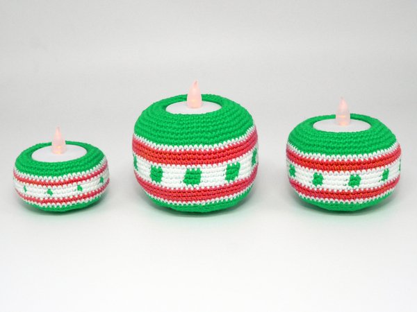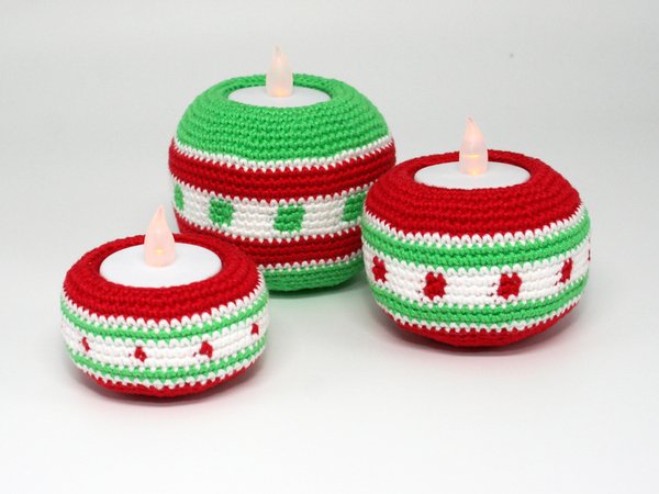 Mit 2.0 mm Nadel und Sport Garn wie z.B. Catona oder Catania Originals werden die Teelichthalter 6,5 x 8 cm, 5 x 7 cm & 4 x 6 cm groß.