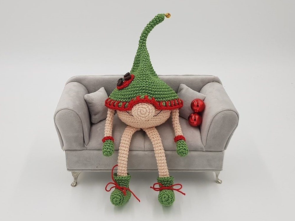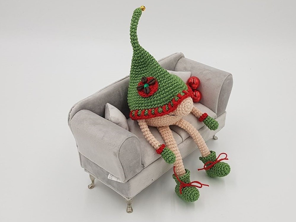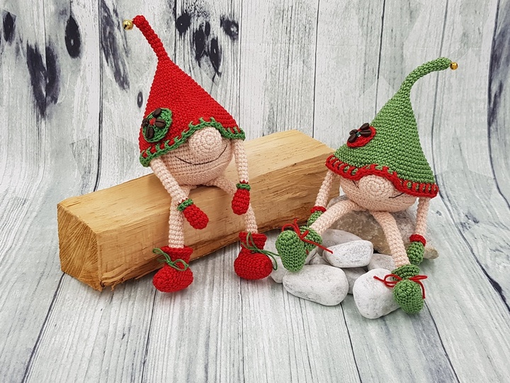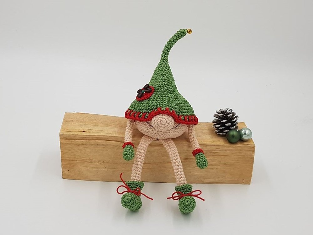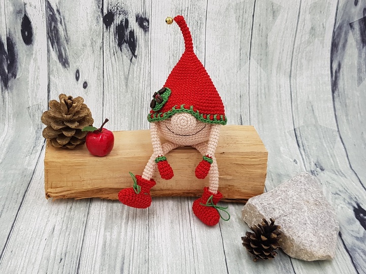Mit den angegebenen Materialien (Baumwolle 125 m - 50 g) und Häkelnadel 2.5 mm wird "Jingle“ ca. 27 cm hoch (gemessen vom Schuh bis zum Mützenzipfel).