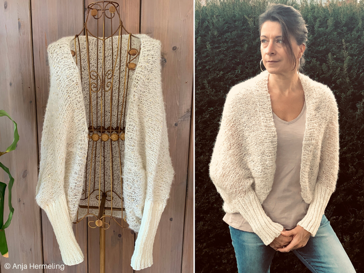 Ein Seelenwärmer, der seinem Namen alle Ehre macht – ein Teil zum Reinkuscheln und Glänzen: Diese flauschige Jacke ist ein Basic-Piece, das sich zu fast allem kombinieren lässt. Die vielseitige und leichte Jacke ist schnell mit dicken Nadeln gestrickt. Das fluffige Garn enthält kleine Goldpailletten, die sehr dezent sind und dennoch jeden Look veredeln. Die Ärmel werden aus weichem Alpaka-Garn gearbeitet.