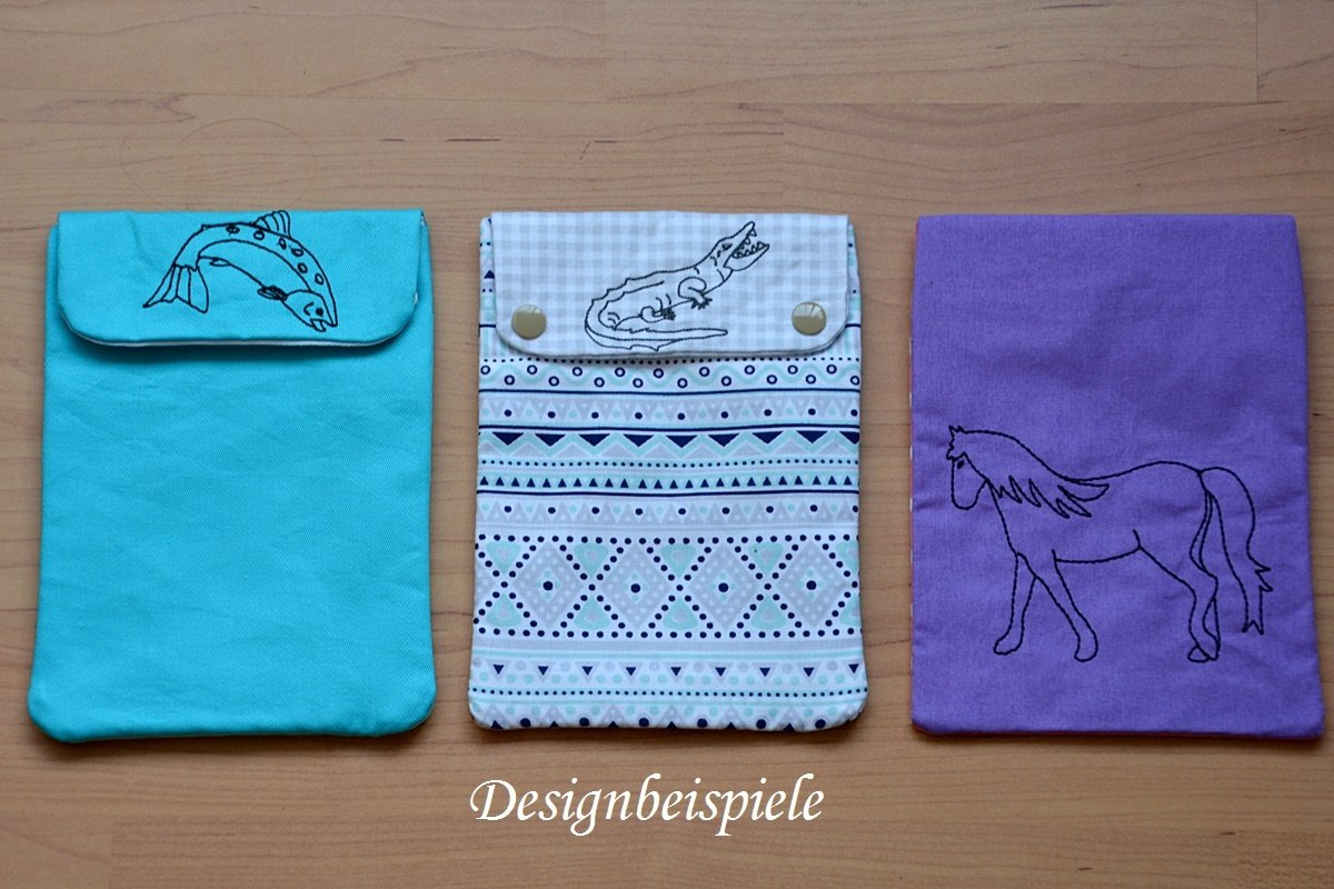 Hast du noch keine schöne Hülle für deinen E-Reader oder du verschenkst einen solchen und möchtest ihn etwas personalisieren? Dazu ist diesen Dateienpaket wie geschaffen! Bestimmt findest du ein passendes Motiv, ansonsten kannst du die Blanko-Hülle mit deinen eigenen Motiven besticken. Immer noch nicht das Richtige? Für diese Fälle habe ich noch zwei Sprüche beigelegt, die perfekt auf die Blanko passen. Wenn du noch den Namen des Beschenkten einfügst, dann wird es sogar noch etwas persönlicher. Bei einigen Hüllen kannst du sogar noch eine Aussentasche machen, so hast du Platz für Anleitung, Notizen oder Kabel und so weiter.