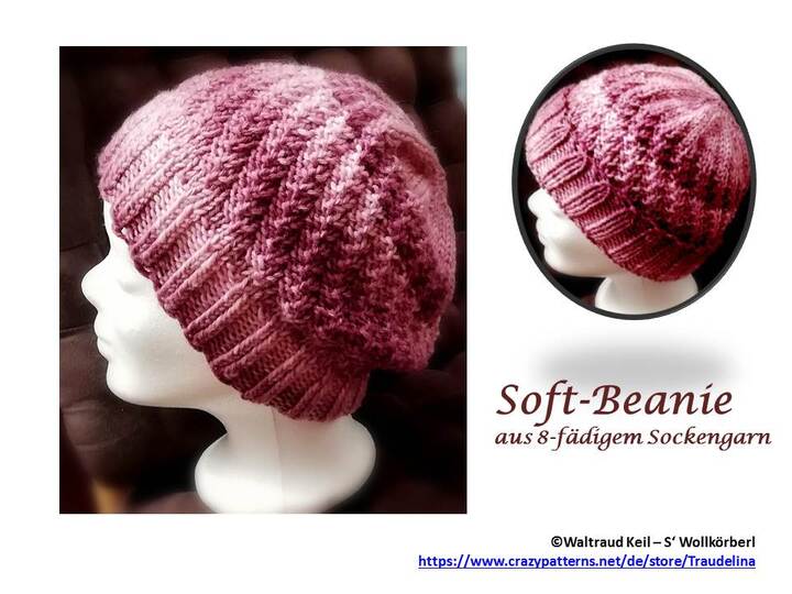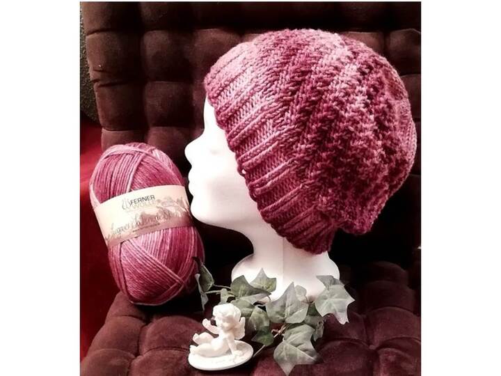 Gestrickt mit einer hier verwendeten Ferner-Sockenwolle mit Merino ist dies eine superweiche Mütze, die sowohl als „Standard-Mütze“ als auch als Beanie getragen werden kann. Die Beanie-Länge (also, wie weit die Beanie hinten runterhängt) kann nach Wunsch selbst bestimmt werden.