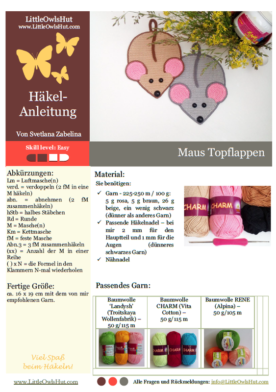 Notwendige Kenntnisse: In Reihen häkeln, feste Masche, verdoppeln, abnehmen, Kettmasche, Krebsmasche.