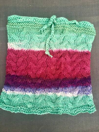 Ich habe mir auch schon eine größere Version aus selbstgesponnener Wolle gestrickt und daran noch einen Innenteil mit Merinowolle drangestrickt. Der ist richtig kuschelig warm.