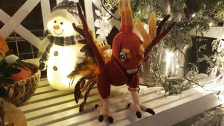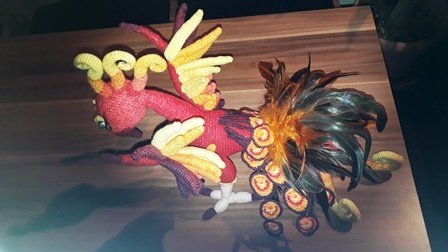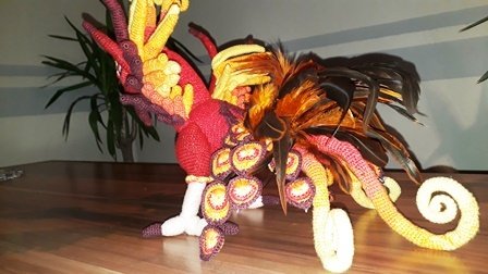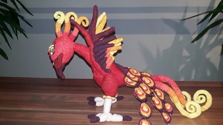 Nach Fertigstellung ist der Feuervogel 30-35 cm groß, je nachdem man welches Garn und Nadel benutzt.