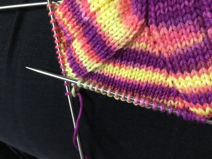 Rund stricken mit dem Nadelspiel. Es spielt dabei aber keine Rolle, ob du mit 4 oder 5 Nadeln in der Runde strickst.