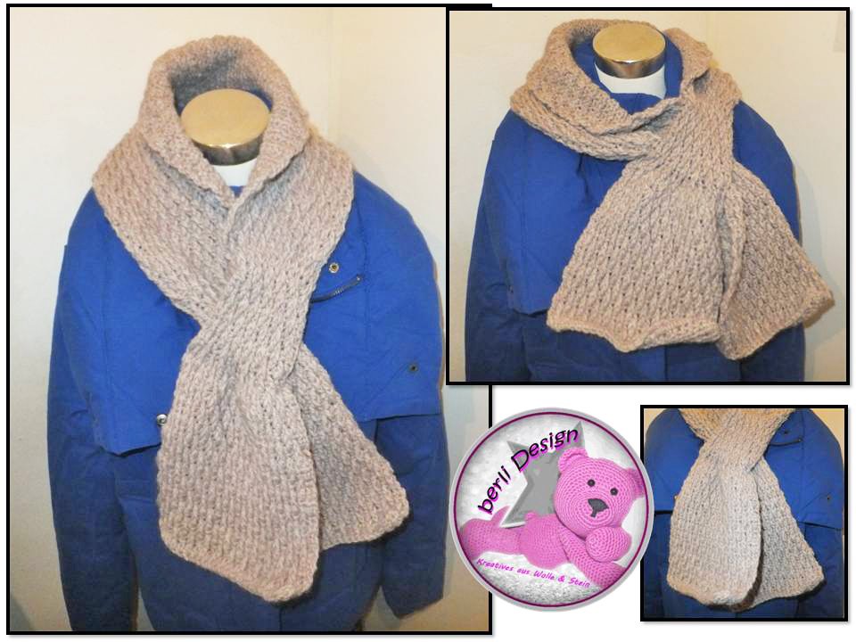 Aufgrund der Schal-Aufmachung wird dieser Schal nicht geknotet, sonder, das eine Ende durch das andere Ende gezogen.