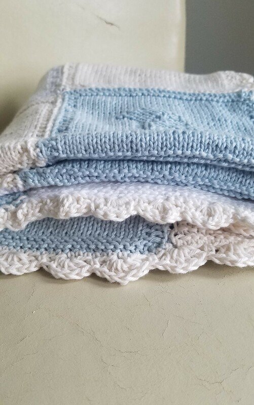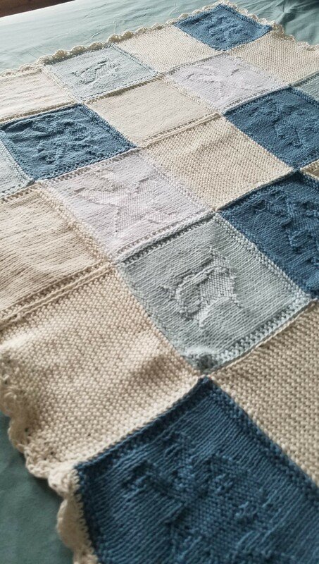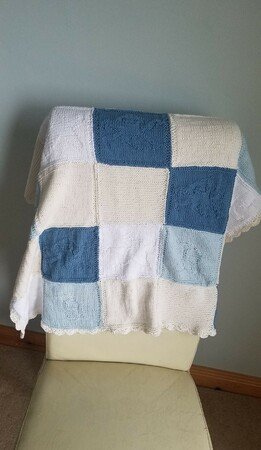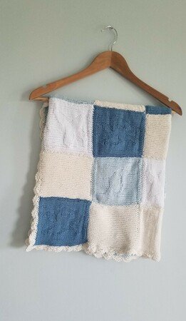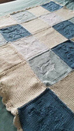 Dies ist eine Anleitung für eine spezielle und einzigartige Babydecke. Sie ist in 4 verschiedenen Farben und 5 verschiedenen Arten gestrickt. Zusammen werden 25x Quadrate gebraucht. (Der Garn kann zu Aran angepasst werden, dazu wird einfach eine Nadel grösse von 4mm verwendet und pro Quadrat werden 25gr verwendet)