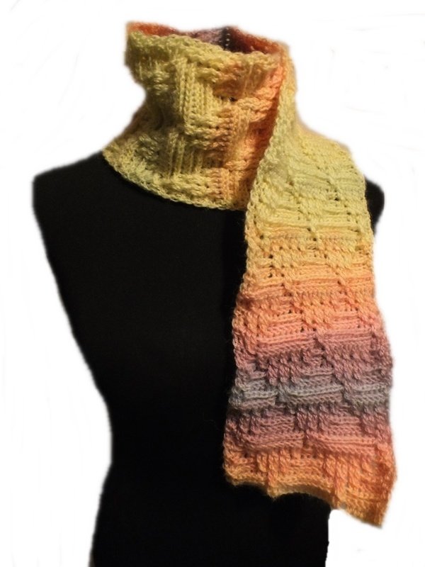 Das Muster setzt sich aus zwei verschiedenen Dreiecken zusammen, die versetzt werden. Eine Dreiecksart besteht aus verkreuzten Reliefstäbchen, was dem Schal ein zusätzliches Highlight verleiht.