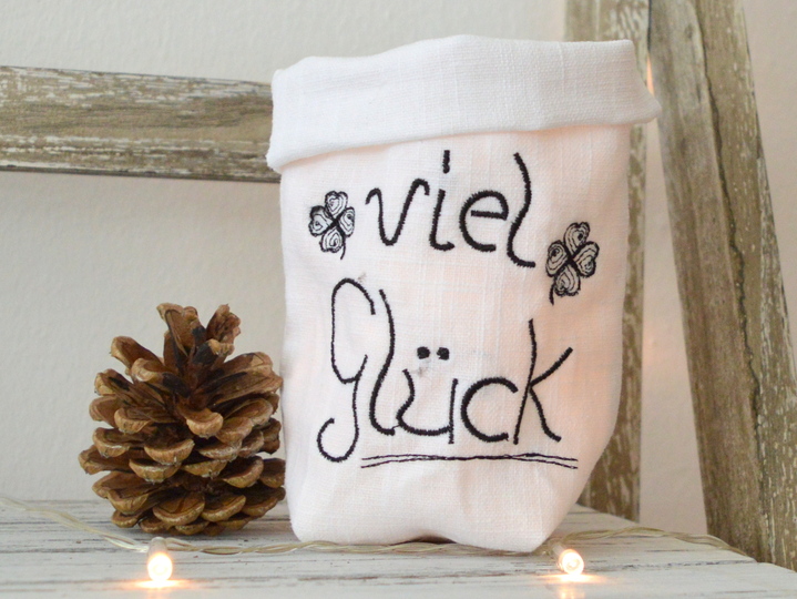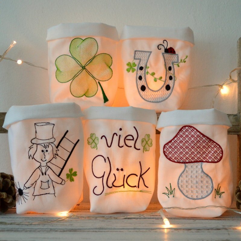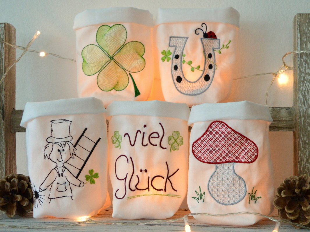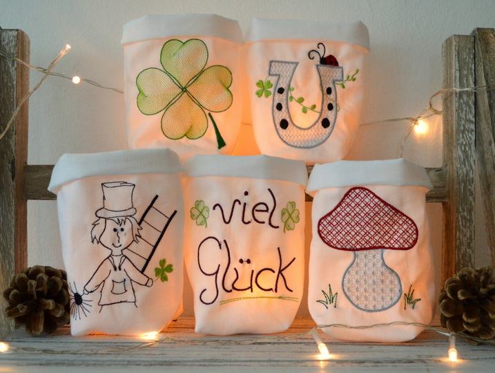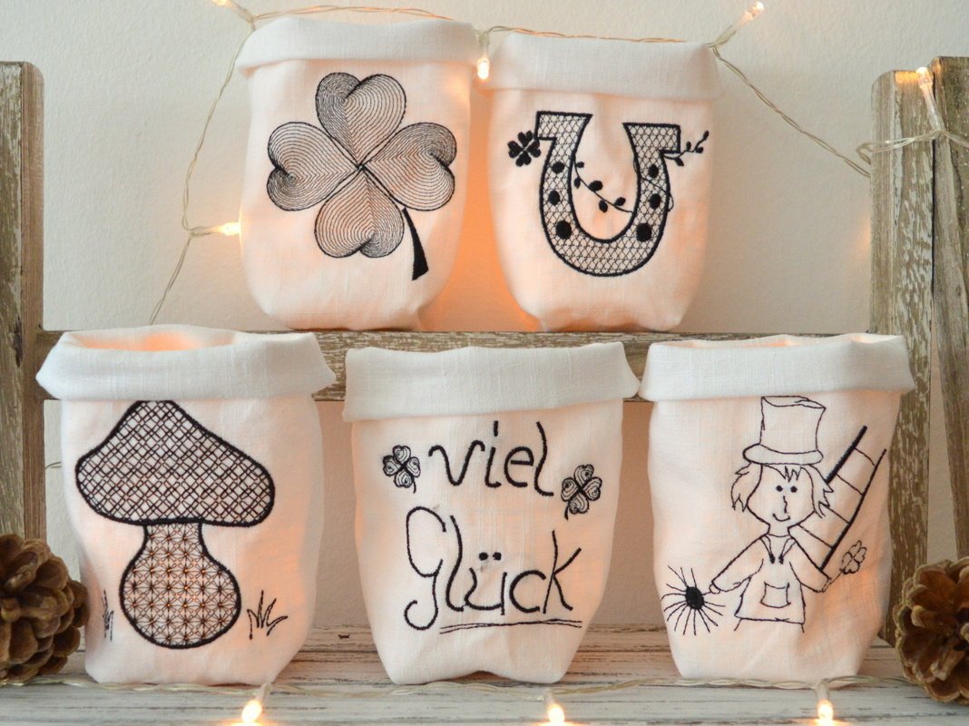 kleine Stoffbeutel mit glücksbringenden Motiven, in die ein LED Teelicht eingestellt werden kann. Süße Deko für die Fensterbank und ein liebevolles Mitbrings`l zu Silvester oder immer dann, wenn man etwas Glück brauchen kann.