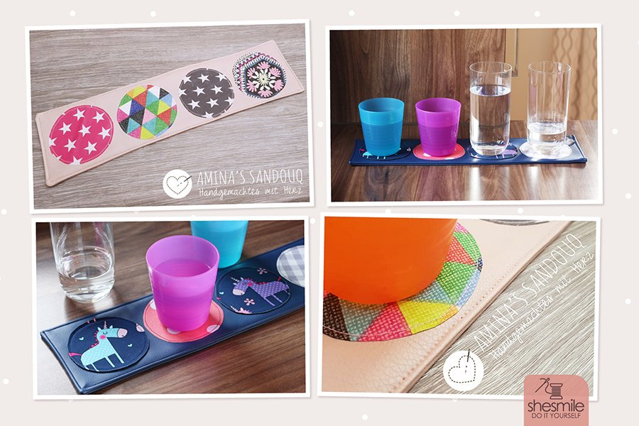 Nähanleitung und Schnittmuster gestaltet als PDF-E-Book für einen Glasuntersetzer. Endlich Ordnung mit dem schnell genähten Lieblingsplatz für alle Trinkgläser der Familie.