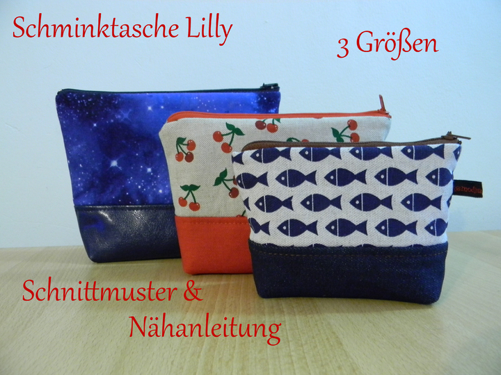 Bei der Schminktasche Lilly kombiniere ich außen sehr gerne gemusterte Stoffe mit unifarbenen Kunstleder, Jeans oder Canvas. Es gibt etliche Kombinationen. Welche wird deine Lieblingskombination?