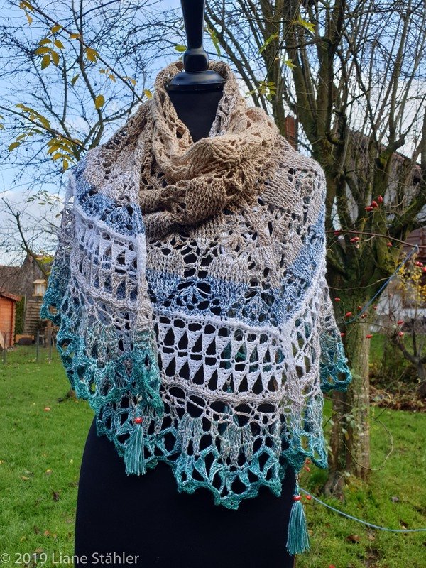 Das mehrfarbige Tuch ist aus 3fädigem Garn von Bobbel-Solo in der Farbe "Meeresrauschen"