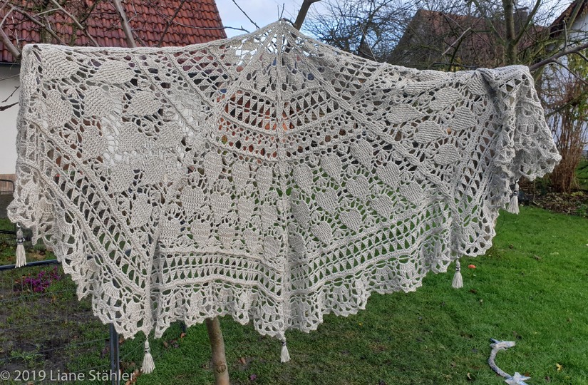 Romantic Hearts ist ein 5eckiges Häkeltuch mit romantischen Herzchen- und Blumenmustern.
