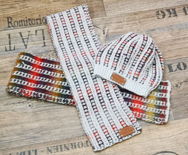 Für die Mütze wird von Uni und buntem Garn jeweils ca. 50 gramm benötigt und beim Schal jeweils 100 gramm
