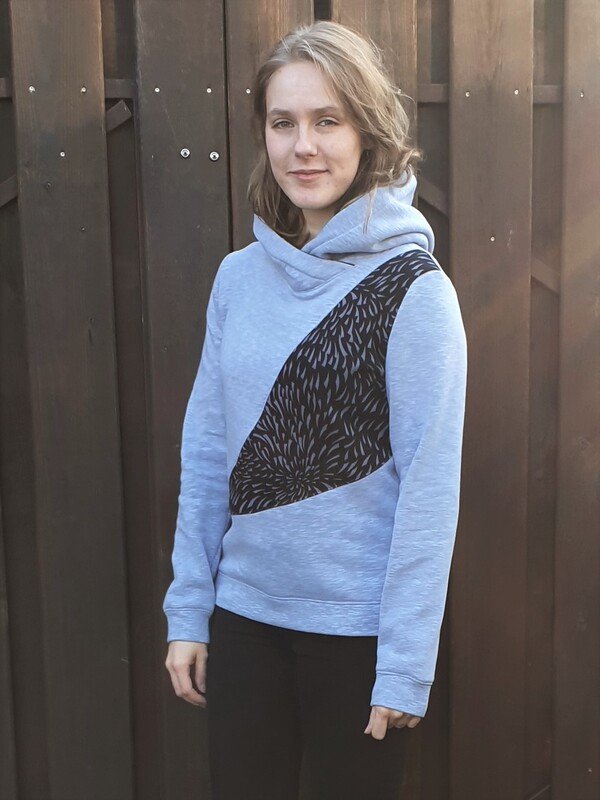 Der Hoodie „Lara“ hat eine bequeme Weite und zeichnet sich durch ein dekoratives Wellenmuster aus. Dieses Muster kann mit verschiedenen Stoffen hervorgehoben werden.