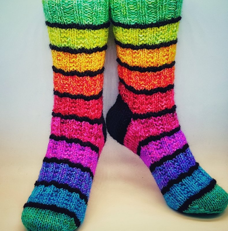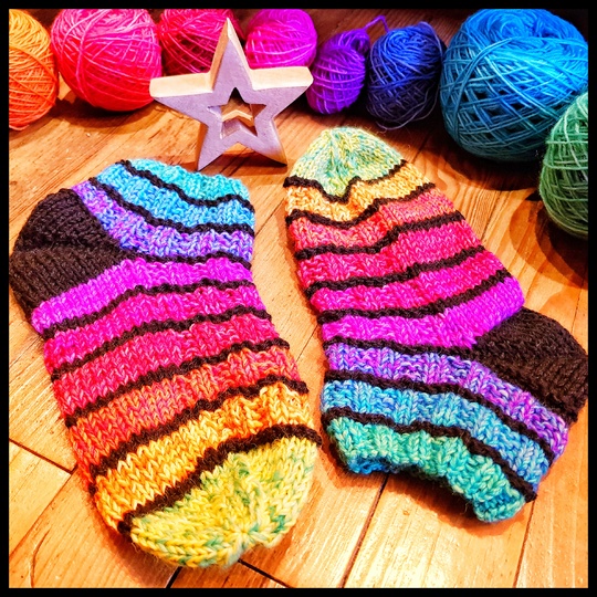 Ich habe die Socken als „Dickerchen“ (aus doppelter Sockenwolle 4fach mit Nadelstärke 3,5) gestrickt. Dabei gibt es schöne Effekte, wenn man 100g Sockenwolle als Hauptfarbe nutzt und diese im Doppel mit allem, was an Sockenwollresten noch da ist, verstrickt.