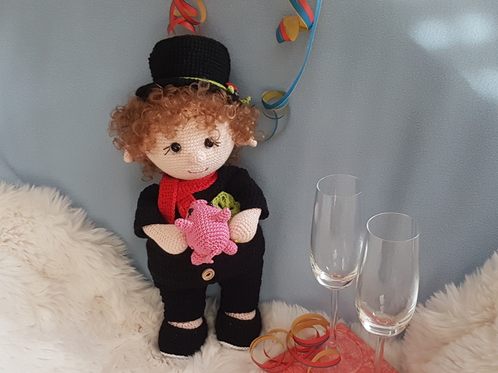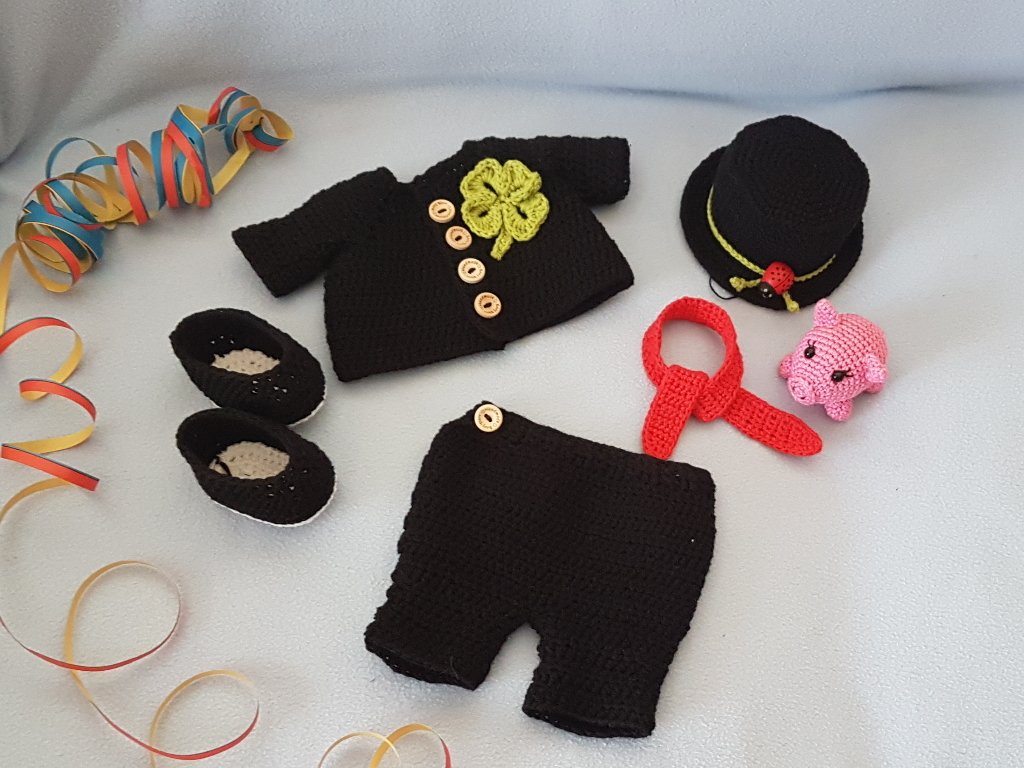 Die PDF beinhaltet die Anleitung für die Hose, das Jäckchen, die Schuhe, den Zylinder, das Halstuch sowie für das Schweinchen.