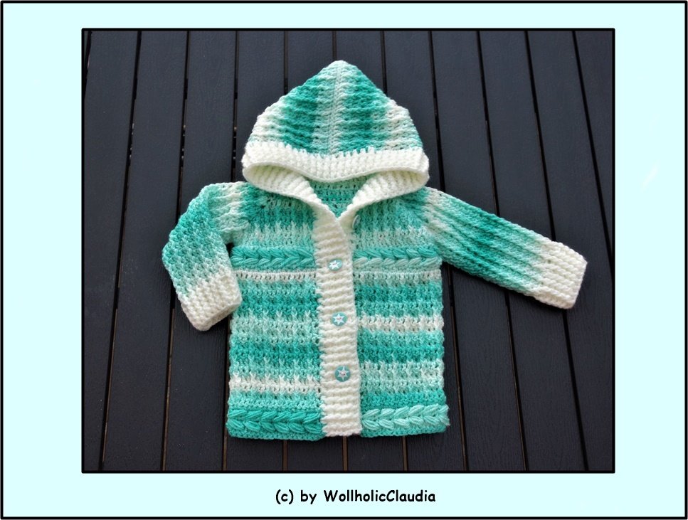 Die Jackenanleitung ist von Gr. 50/56 bis einschließlich Größe 134/140 beschrieben, kann aber ganz einfach vergrößert werden.