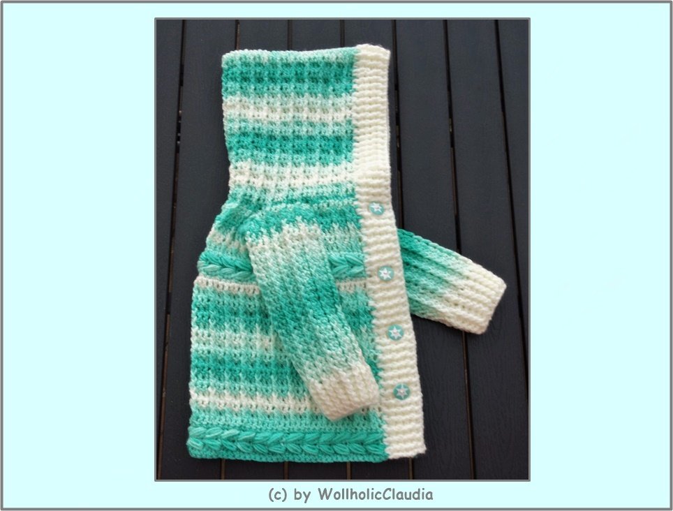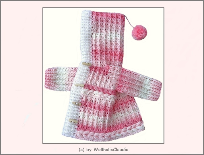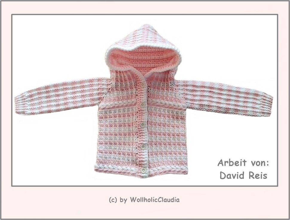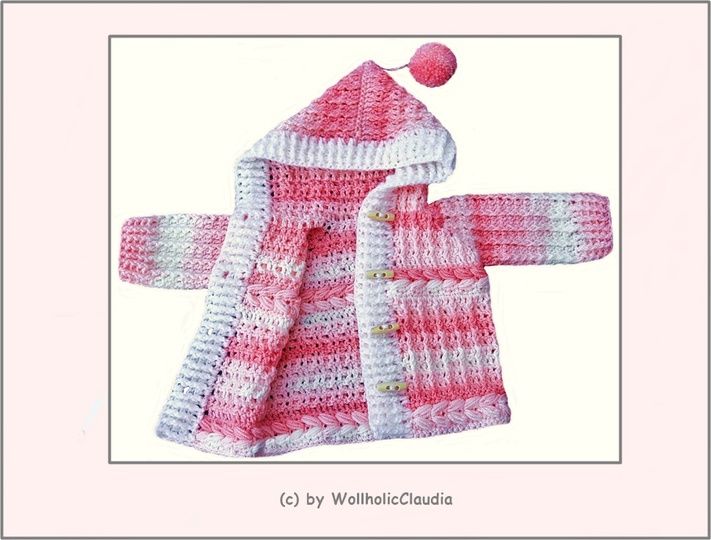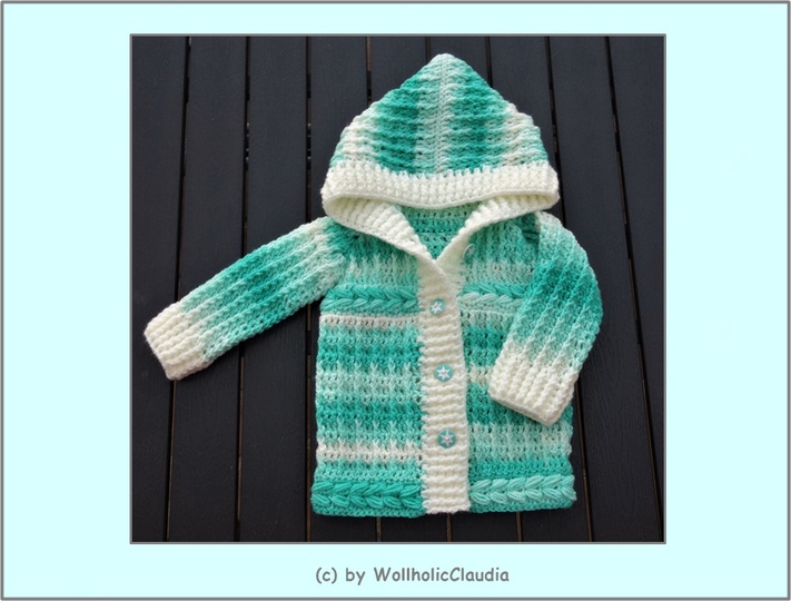 Die Jackenanleitung ist von Gr. 50/56 bis einschließlich Größe 134/140 beschrieben, kann aber ganz einfach vergrößert werden.