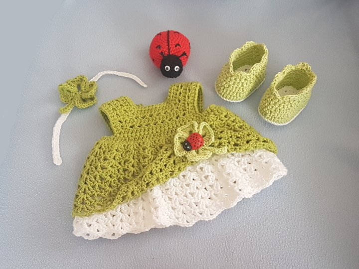 Die PDF beinhaltet die Anleitung für das Kleid, die Schuhe, die Haarbänder mit dem Kleeblatt sowie für den Marienkäfer.